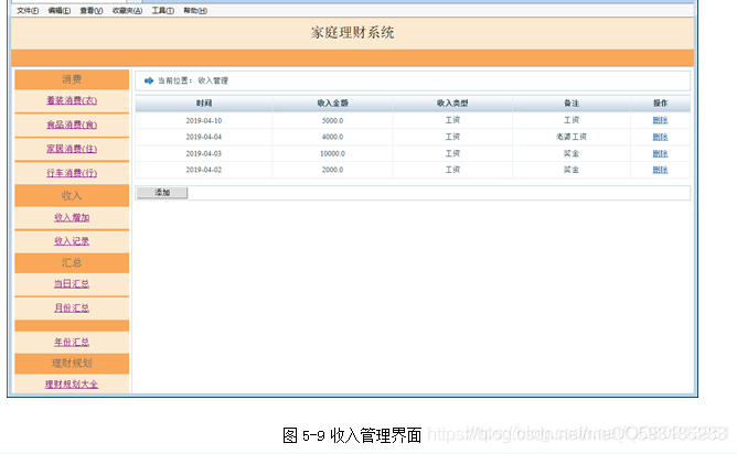 收入管理模块主要完成对收入信息的查看与维护操作,用户可以查看收入信息,也可以对收信息进行删除的操作,收入管理模块对应的磁盘为shourumama.action,收入管理模块对应的界面设计如图5-9所示: