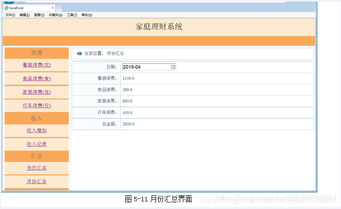 当日汇总模块用于统计某天的支出消费信息,分类汇总着装消费、食品消费、家居消费、行车消费等分项的和及消费总额,当日汇总模块对应的页面文件为Huizongdangri.action,当日汇总模块的页面设计如图5-10所示: