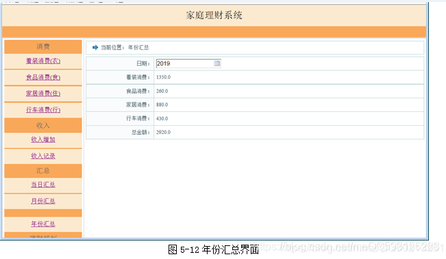 年份汇总模块统计某年的着装消费合计、食品消费合计、家居消费合计、行车消费合计等功能,年份汇总模块对应的磁盘文件为Huizongnianfen.action。年份汇总模块的设计如图5-12所示: