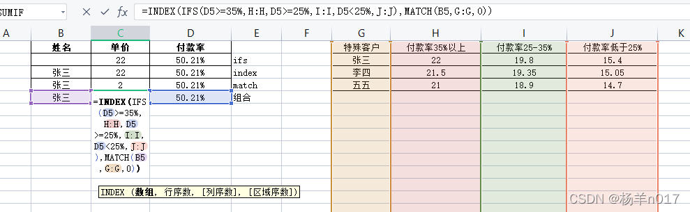 2、根据不同的客户,返回对应付款率的价格,可用INDEX()函数来取指定位置的值,INDEX(查找区域,行数,列数)