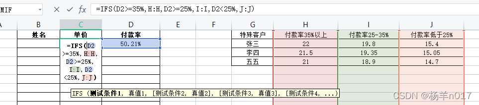 1、首先判断付款率,指定的付款率范围返回对应的价格,用多条件判断IFS()函数(前一章有讲解IFS()函数的使用),对应多值时默认返回第一个