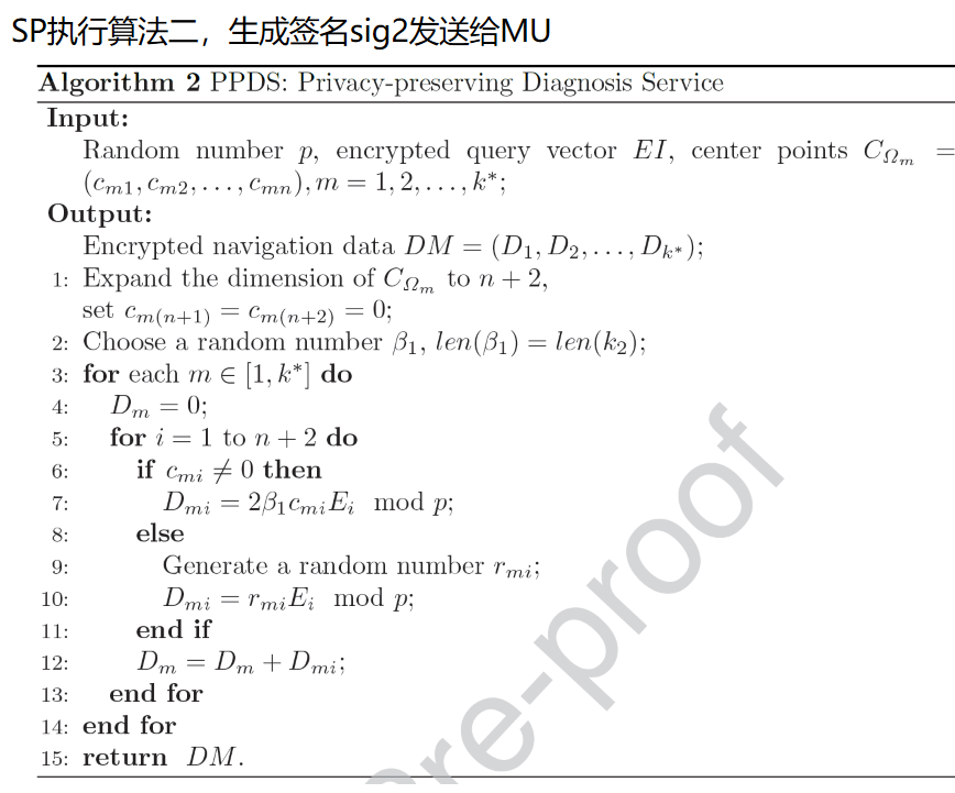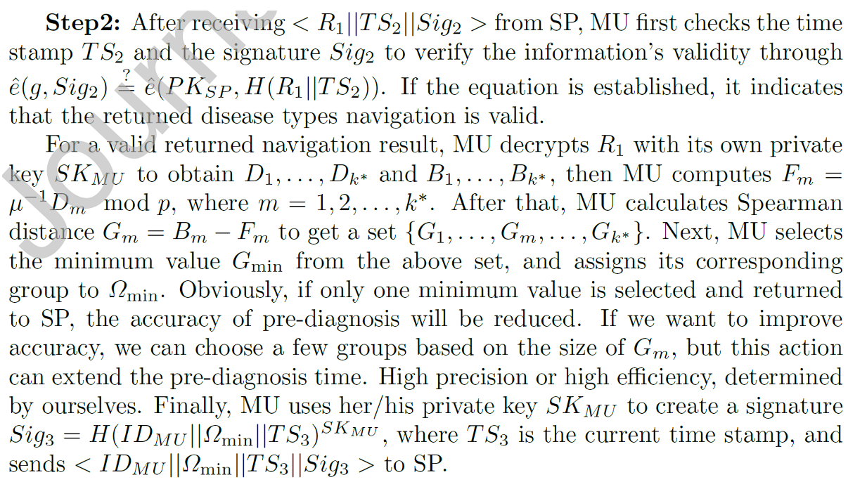 解密计算后得到Spearman距离集,选择距离最小的一个聚类中心,即可得到对应的簇。(注意,如果只选择一个最小值,预诊断的准确性会下降,但是如果我们选择多个较少的值,效率就会下降。所以选择高准确性还是高效率由MU决定。)MU创建sig3并发送给SP。