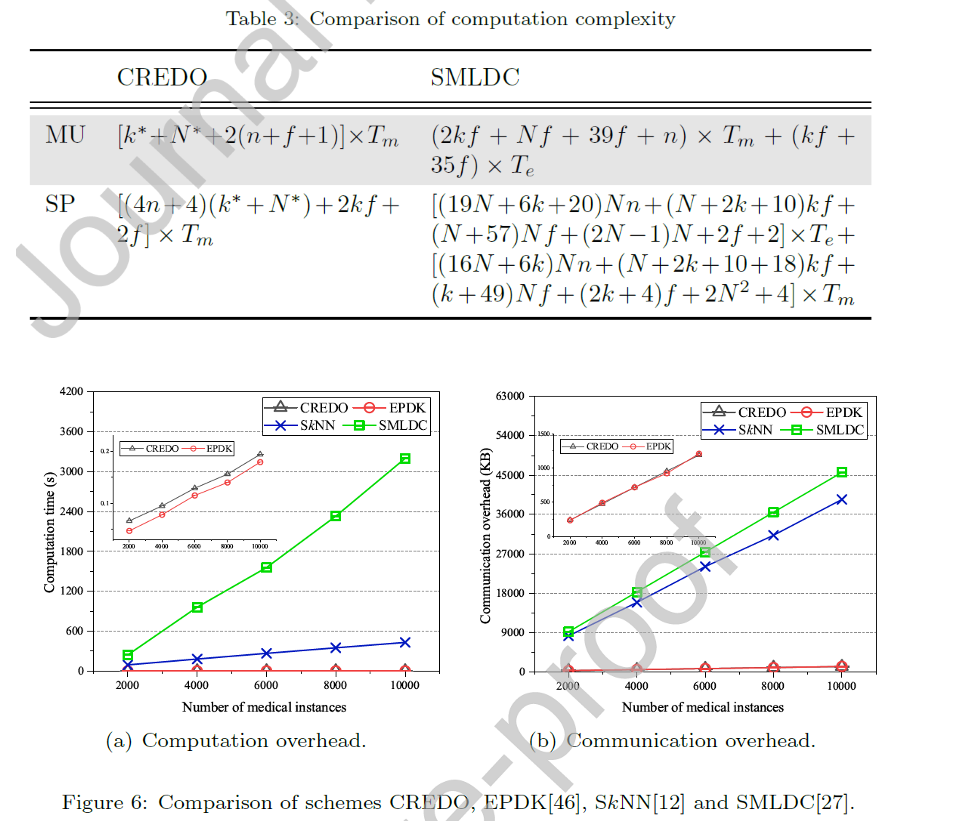 不同于上述所有作品,CREDO基于k-means聚类和ML-kNN分类,适用于多标签医学实例,通过引入另一种交互聚类,实现更高效的预诊断服务。此外,CREDO针对隐私问题,对MU和SP的敏感信息进行保护。CREDO可以很容易地在智能手机和电脑上实现,因为它的效率高,计算开销低。
