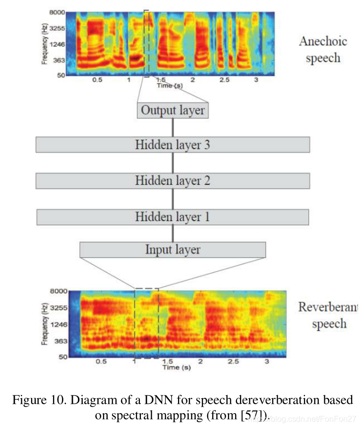 Han等人[57]提出了第一种基于DNN的语音去噪方法。这种方法在耳蜗图(cochleagram)上使用谱映射(spectral mapping)。换句话说,DNN被训练成从混响语音帧窗口映射到无混响语音帧,如图10所示。训练后的DNN能很好地重建无回声语音的耳蜗图。在他们后来的工作[58]中,他们在谱图上应用了谱映射,并扩展了方法来执行去混响和去噪。