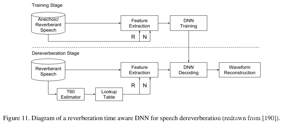 Wu等人最近提出了一种更复杂的系统[190],他们观察到,当帧长和移位根据混响时间(T60)的不同选择时,去混响性能会得到改善。在此基础上,他们的系统包括T60作为特征提取和DNN训练的控制参数。在去混响阶段,估计T60,选择合适的帧长和偏移量进行特征提取。这种所谓的混响时间感知模型如图11所示。他们的比较表明在[58]的DNN的去噪性能上有改进。