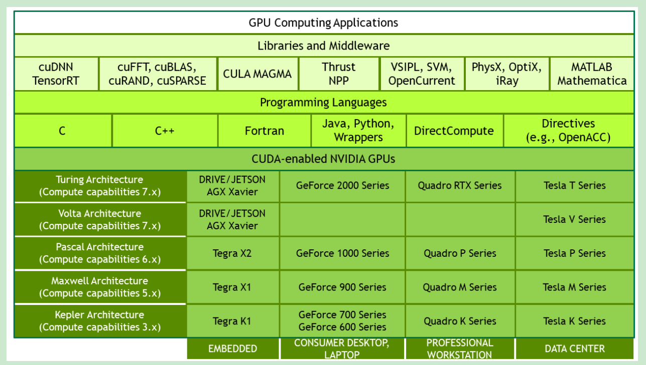 这个其实就是一个专门为深度学习计算设计的软件库,里面提供了很多专门的计算函数,如卷积等。从上图也可以看到,还有很多其他的软件库和中间件,包括实现c++ STL的thrust、实现gpu版本blas的cublas、实现快速傅里叶变换的cuFFT、实现稀疏矩阵运算操作的cuSparse以及实现深度学习网络加速的cuDNN等等,具体细节可参阅GPU-Accelerated Libraries