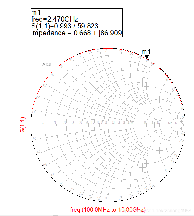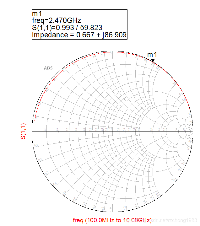 , 使用 s参数仿真,可知其阻抗为:0.667+j*86.909 ;