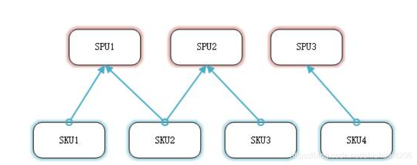 商品SPU和商品SKU是包含关系,一个商品SPU包含若干个商品SKU子实体,商品SKU从属于商品SPU。
