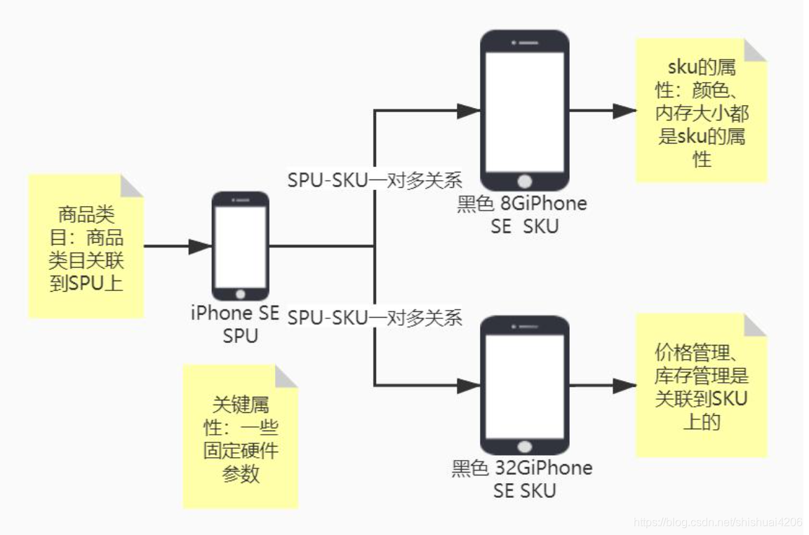 举例说明一下,比如我们买东西搜索到的都是Spu,具体下单的时候,到订单里的就是Sku了。比如要买一个手机【iPhone12黑色128G】,那么苹果12就是Spu,有基础属性(商品属性/关键属性)核数、大小尺寸、CPU参数、电池等属性, iPhone12黑色128G是Sku,有销售属性价格、库存等属性。图就不自己画了,给大家找一个现成的。