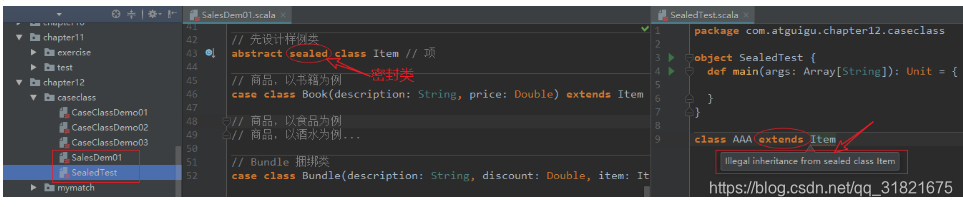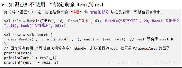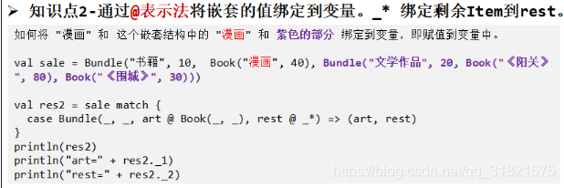 package com.atguigu.chapter12.caseclassobject SalesDem01 {def main(args: Array[String]): Unit = {// 具体的打折案例表示:有一捆书,漫画(一本)(40-10) + 文学作品(两本)(80+30-20) = 30 + 90 = 120.0val sale = Bundle("书籍", 10, Book("漫画", 40), Bundle("文学作品", 20, Book("《阳关》", 80), Book("《围城》", 30)))// 知识点1:取出这个嵌套结构中的 "漫画"的描述val res = sale match {// 如果我们进行对象匹配时,不想接受某些值,则使用_ 忽略即可,_* 表示忽略所有。case Bundle(_, _, Book(desc, _), _*) => desc}println("res=" + res)// 知识点2:如何将 "漫画" 和 这个嵌套结构中的 "漫画" 和 紫色的部分 绑定到变量,即赋值到变量中。val res2 = sale match {case Bundle(_, _, art @ Book(_, _), rest @ _*) => (art, rest)}println("art=" + res2._1)println("rest=" + res2._2)// 知识点3:如何将 "漫画" 和 这个嵌套结构中的 "漫画" 和 紫色的部分 绑定到变量,即赋值到变量中。明确说明没有多个 Bundle。val res3 = sale match {case Bundle(_, _, art @ Book(_, _), rest) => (art, rest) // rest 等价于 rest @ _}println("art=" + res3._1)println("rest=" + res3._2)// 匹配嵌套案例完成def price(it: Item): Double = {it match {case Book(_, price) => price// 生成一个新的集合,_是将 its 中每个循环的元素传递到 price 中 it 中。递归操作case Bundle(_, disc, its @ _*) => its.map(price).sum - disc}}println(price(sale))}