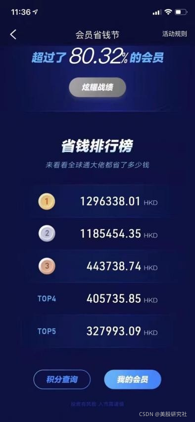 之前涨乐省钱节这个排行榜算是一个标准答案:榜一大佬省下来的手续费快到130万港元了,更别提投资带来的复利,完美诠释什么叫“省钱即赚钱”。要想省心炒美港股,选涨乐全球通的优势一览无余。
