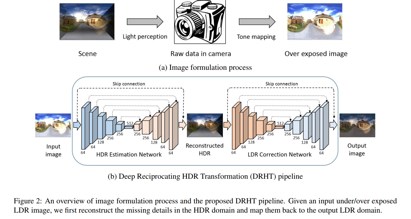然而,当选择了不合适的曝光时间时,现有的CRFs既不能纠正ccd中的原始数据,也不能纠正输出的LDR图像。这导致了在LDR图像中曝光不足/过曝。基于这个过程,本文作者提出DRHT 进行图像修正。它包含两个CNN网络。第一个CNN网络重建了HDR域中缺失的细节,第二个CNN网络将细节传输回LDR域中。通过往复的HDR变换过程,在中间HDR域中对LDR图像进行校正。
