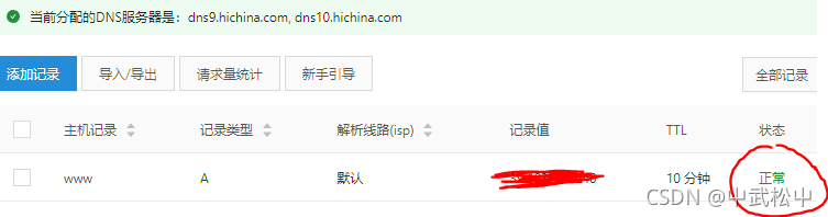 这里将你的服务器公网IP(在步骤一中可以查询)输入 记录值 一栏,在主机记录一栏输入 ”WWW“(也可以输别的)。