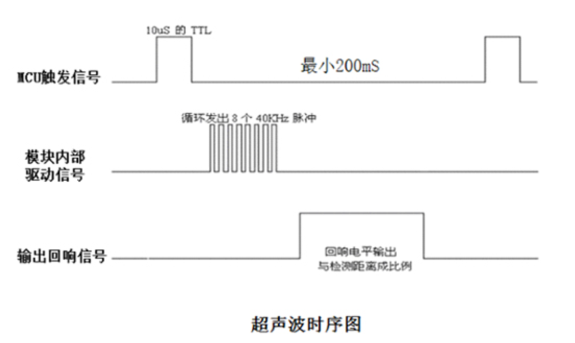从图中可知:需要提供一个不小于10us的脉冲信号,模块会发射8个40KHZ的脉冲信号,并接收返回的信号,返回的信号是一个与距离成比例的高电平,通过检测高电平的持续时间,通过相应的公式便可测出距离=(高电平时间*声速(340M/S))/2;