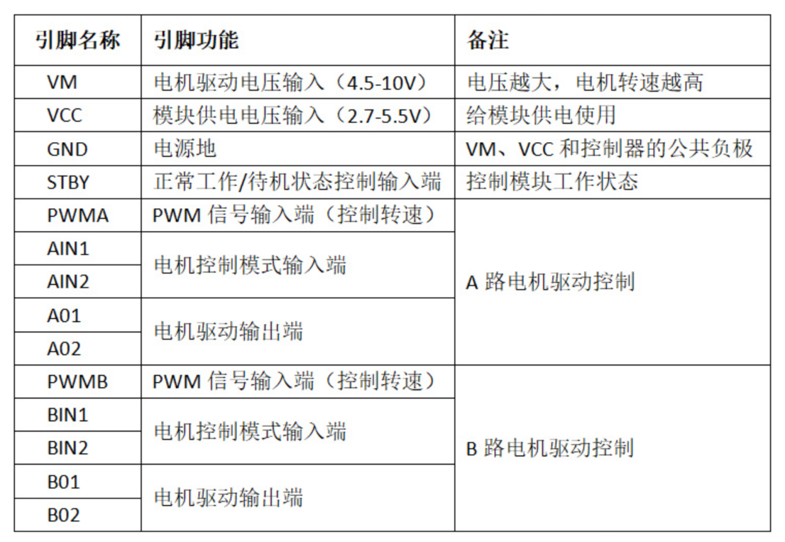 TB6612FNG的引脚相较于L298N更为复杂。其各引脚功能如下图: