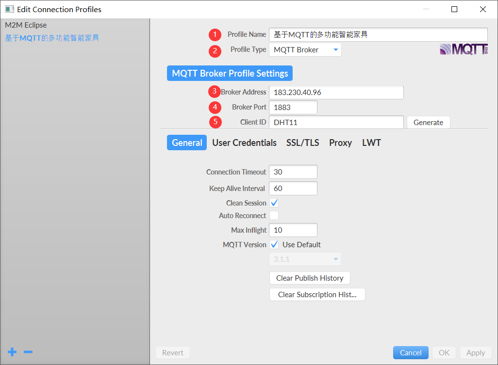⑤ Client ID:客户端ID,这里填入的是创建的MQTT套件中的设备名称;在MQTT物联网套件下的设备列表中选择需要模拟设备名称,我这里选择DHT11