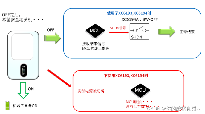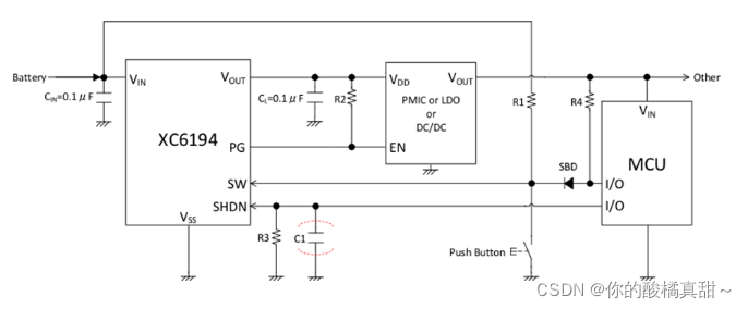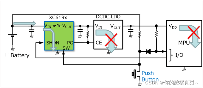 用XC6193、XC6194切断电池后段,只有XC6193、XC6194消耗电流(IQ=0.001μA)。