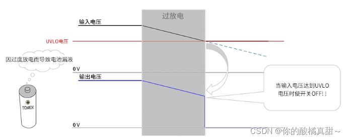 作为电池漏液的原因之一是电池过度放电,可以由本IC的输入电压UVLO功能实现部分地解决。当持续过度放电状态,电池电压下降到一定数值时,根据本功能可以把电源从ON状态切换到OFF状态以解消过度放电状态。
