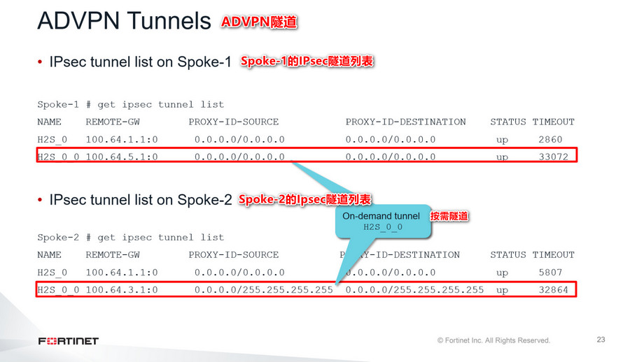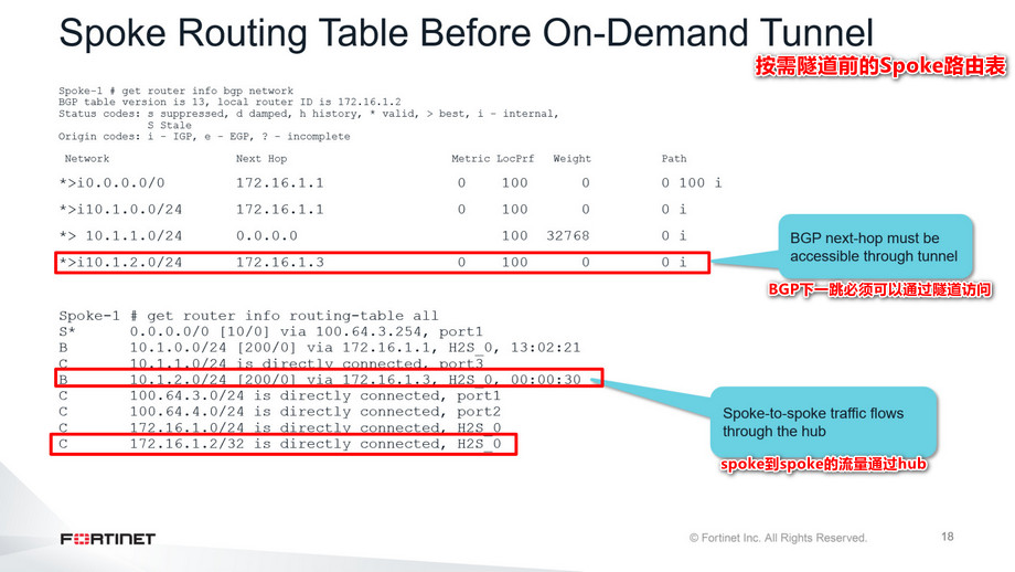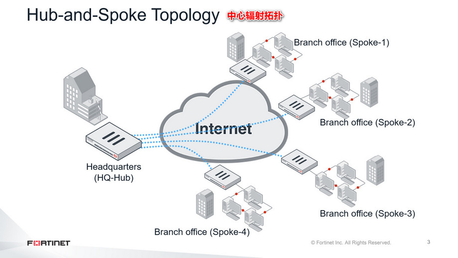 在本幻灯片所示的示例中,每个客户端辐条都是一个分支机构FortiGate。任何分支机构要到达另一个分支机构,其流量必须通过中心。