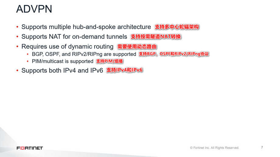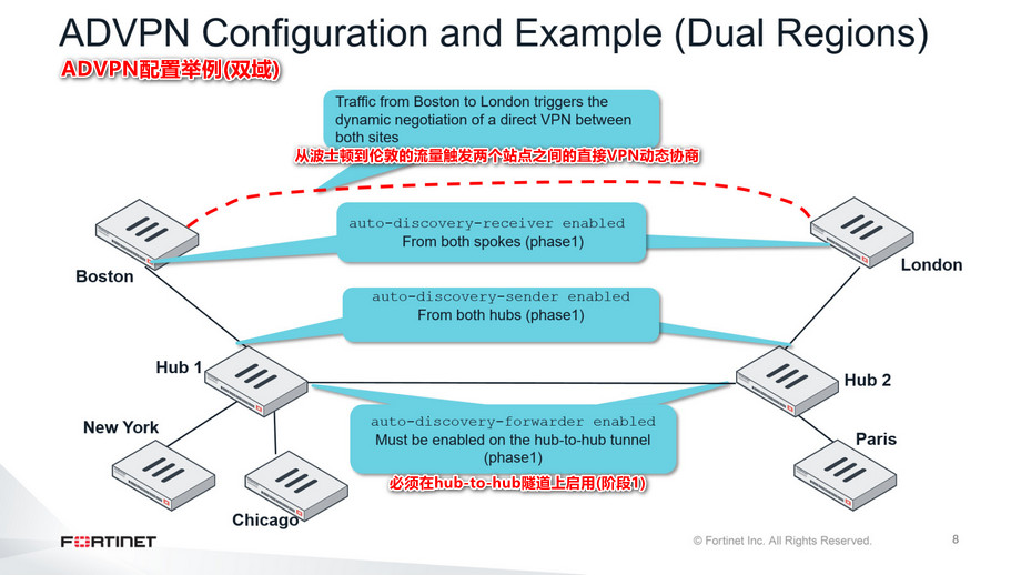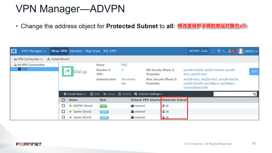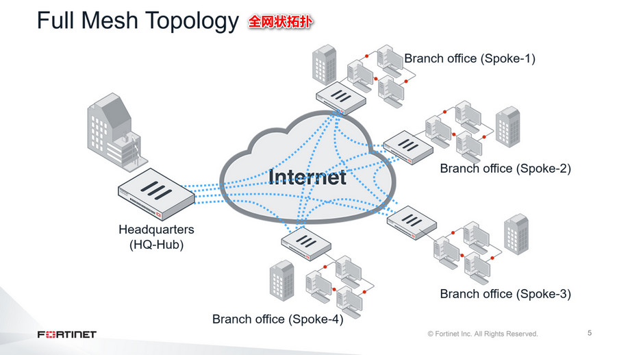 部分网格试图妥协,最小化所需的资源和延迟。如果每个位置之间不需要通信,部分网格可以是合适的。这张幻灯片显示了Spoke-1和Spoke-2,以及Spoke-3和Spoke-4之间的附加连接。然而,每个FortiGate的配置仍然比中心辐射更复杂。特别是路由,可能需要广泛的规划。