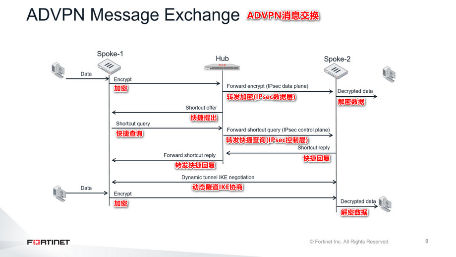 ADVPN是FortiOS 5.4中引入的。它结合了中心轮辐和全网状拓扑的优点,因为所有的轮辐到轮辐隧道都是根据需要动态创建的。在两个轮辐之间建立一条捷径隧道,路由已经汇合后,轮辐对轮辐的流量不再需要通过中心。ADVPN提供直接连接。