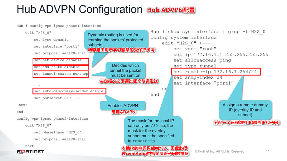 这张幻灯片显示了Hub中的以下ADVPN配置: