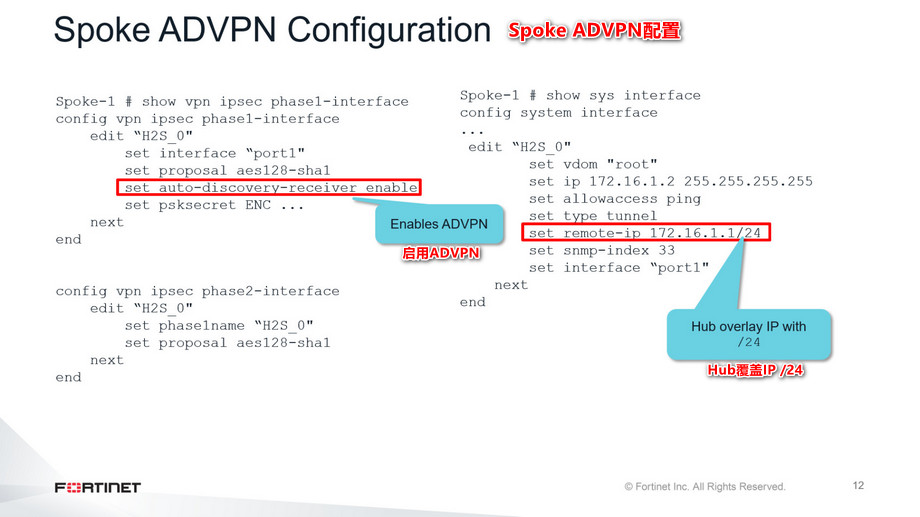 这张幻灯片显示了以下在辐条中的ADVPN配置: