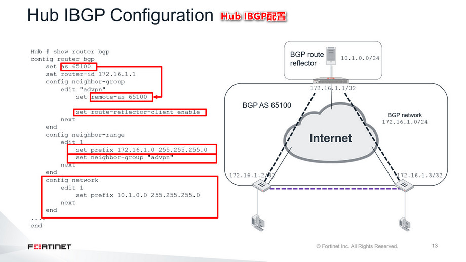 这张幻灯片显示了Hub中的IBGP配置如下: