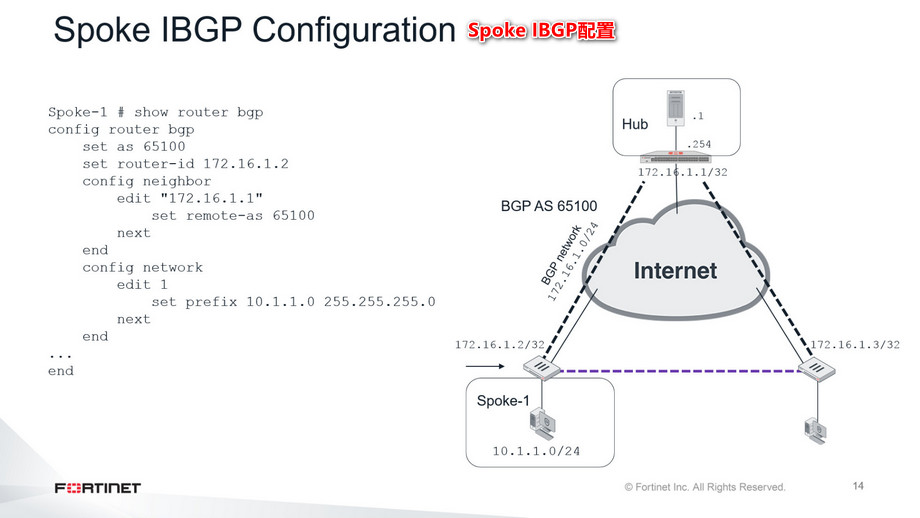 这张幻灯片显示了IBGP在其中一个辐条上的如下配置: