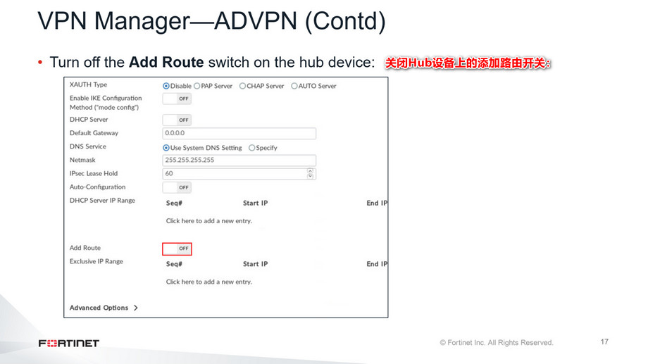 对于ADVPN,需要关闭hub的VPN网关配置下的添加路由开关。