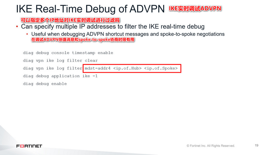 调试IKE时可以指定多个IP地址。这在调试ADVPN快捷方式和spoke-to-spoke ADVPN协商问题时非常有用。