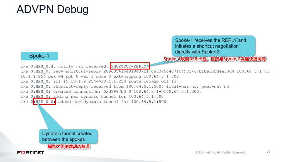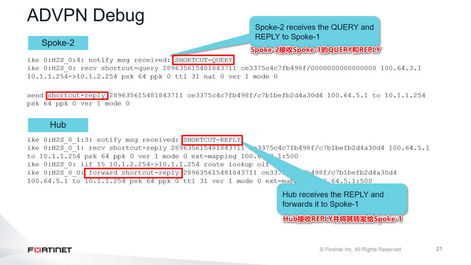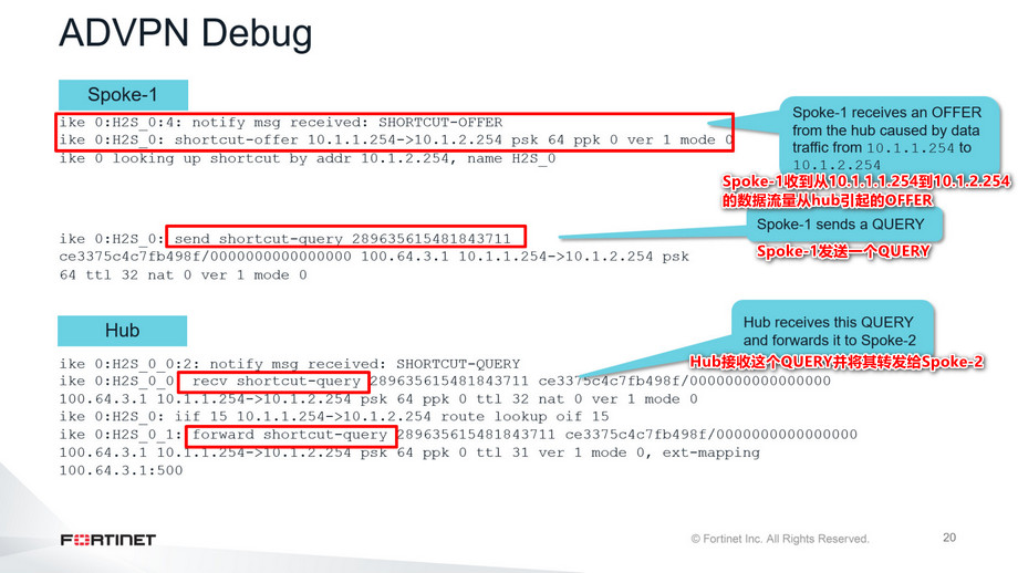 如果在ADVPN隧道协商过程中运行IKE实时调试,将会看到所有快捷方式的交换。这张幻灯片显示了实时调试的输出示例。你可以看到,由于从Spoke-1到Spoke-2的数据流量,Spoke-1收到了Hub的OFFER。