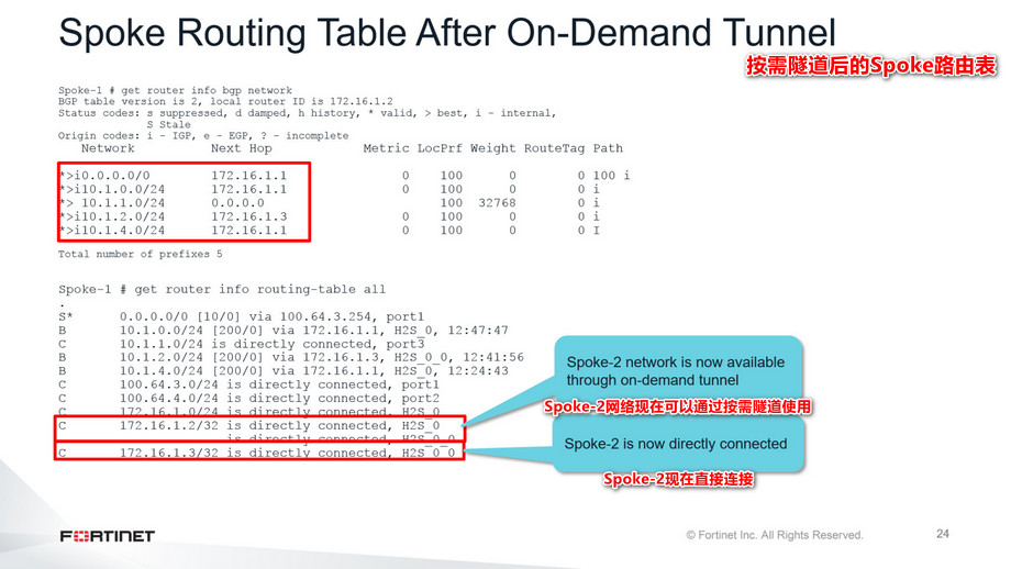 这张幻灯片显示,Spoke-1通过BGP学习到了到hub和到Spoke-2网络的路由。Spoke-2目前可以通过hub访问。