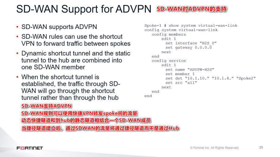 在FortiOS 6.2.1和更高版本中,SD-WAN现在支持ADVPN。在此特性之前,SD-WAN只能使用静态VPN作为成员,不支持快捷隧道。