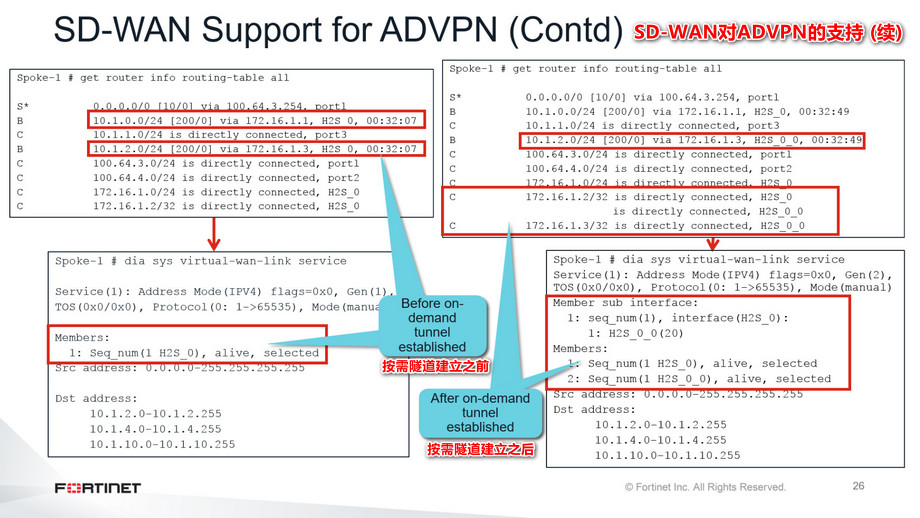 如图所示,可以看到快捷隧道建立前后ADVPN的路由表和服务信息的对比。可以验证SD-WAN规则是否自动将快捷隧道添加为静态隧道的子接口。