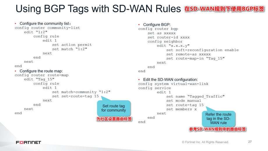 SD-WAN规则可以将BGP学到的路由作为动态目的地。你可以接受匹配团体的路由,并为路由设置标签。这些标签可以作为SD-WAN规则中的动态目的地。