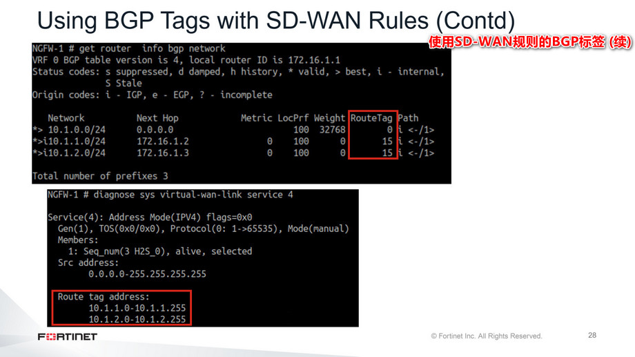 可以看到匹配团体 1:2的路由被标记为15。这些路由会自动添加到SD-WAN规则设置中,以匹配动态目的匹配路由标签15。