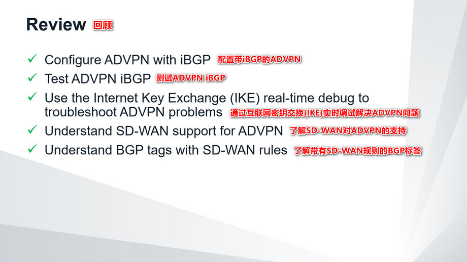 通过掌握本课的目标,你学习了如何使用iBGP配置ADVPN。测试ADVPN,了解SD-WAN对ADVPN的支持。