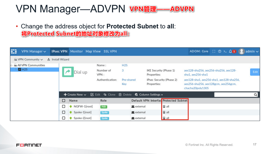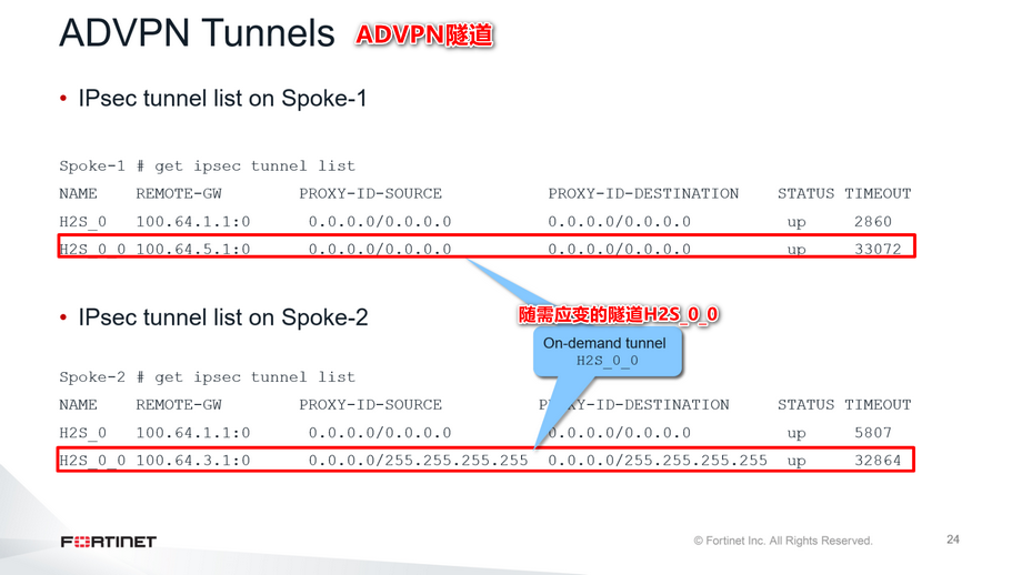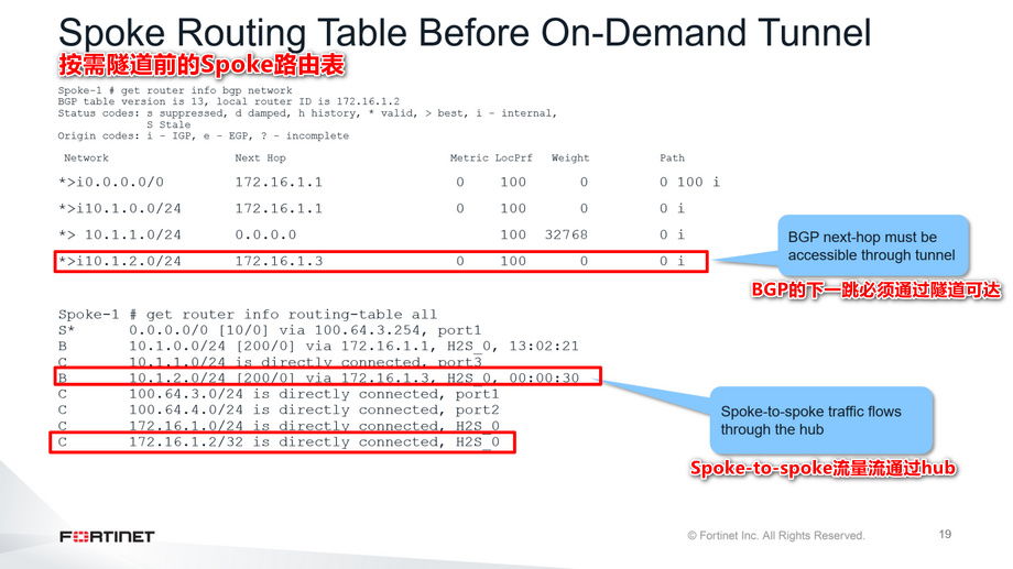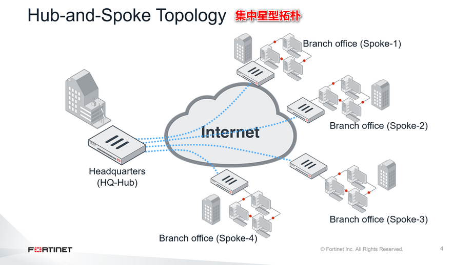 在本幻灯片所示的示例中,每个客户端spoke是一个分支机构FortiGate。任何分支机构要到达另一个分支机构,它的流量必须通过中心。