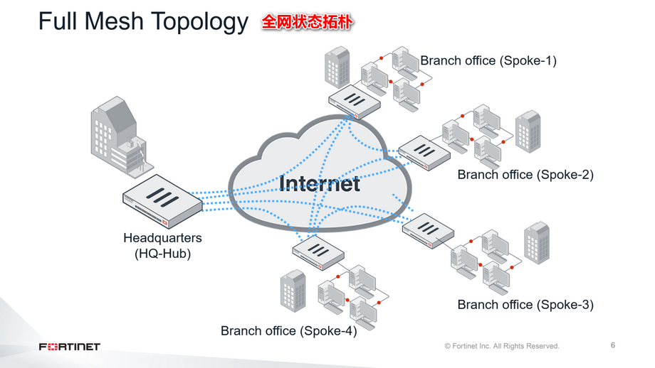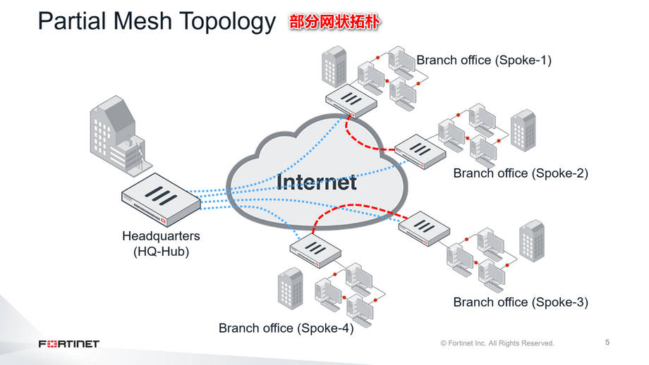 部分网状试图妥协,尽量减少所需的资源和延迟。如果每个位置之间不需要通信,部分网状可以是合适的。这张幻灯片显示了Spoke-1和Spoke-2以及Spoke-3和Spoke-4之间的额外连接。然而,每个FortiGate的配置仍然比集中星型更为复杂。特别是路由,可能需要大量的计划。