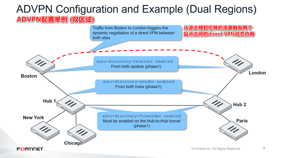 动态隧道之间的辐条是创建的需求。假设一个在波士顿的用户向伦敦发送流量。最初,波士顿和伦敦之间的直接隧道还没有谈判。因此,从波士顿到伦敦的第一个数据包通过Hub1和Hub2路由。当Hub1收到这些数据包时,它知道由于auto-discovery-sender启用设置,所有到伦敦的vpn中都启用了ADVPN。因此,Hub1向波士顿发送一条IKE消息,通知它可以尝试协商到伦敦的直接连接。在收到此IKE消息后,波士顿创建一个特定于FortiOS的IKE信息消息,其中包含其公共IP地址、其本地子网、所需的目标子网(伦敦子网)和自动生成的PSK(也可以使用数字证书身份验证)。此IKE消息通过Hub1和Hub2发送到伦敦。当伦敦收到来自波士顿的IKE消息时,存储PSK,并回复另一条包含伦敦公网IP地址的IKE信息消息。当应答到达波士顿后,两端对等体开始协商动态隧道。协商成功,因为伦敦正在等待来自波士顿公共IP地址的连接尝试。你将在接下来的几张幻灯片中更详细地探讨这个问题。