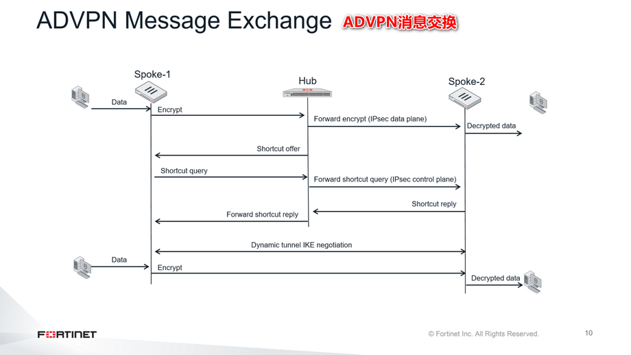 自动发现IPsec是在FortiOS 5.4中引入的。它结合了集中星型和全网状状拓扑的优点,因为所有spoke-to-spoke隧道都是根据需要动态创建的。当两条spoke之间建立了快捷隧道,且路由融合后,spoke-to-spoke的流量不再需要经过hub时,自动发现IPsec提供了直接连接。