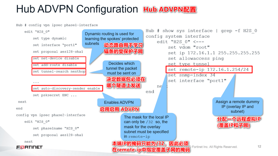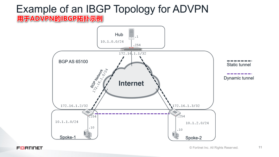 这张幻灯片显示了Hub中的以下ADVPN配置: