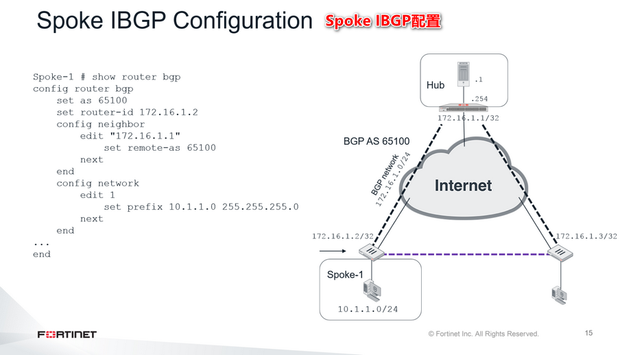 这张幻灯片显示了其中一条辐条上的IBGP配置: