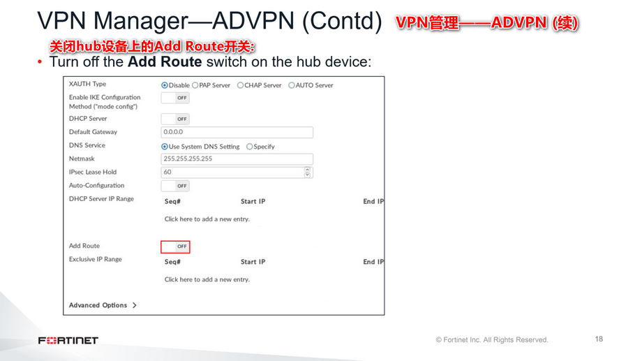 对于ADVPN,关闭集线器的VPN网关配置下的“Add Route”开关。