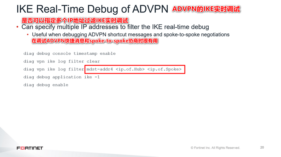 调试IKE时可以指定多个IP地址。这在调试ADVPN快捷方式和spoke-to-spoke ADVPN协商问题时非常有用。