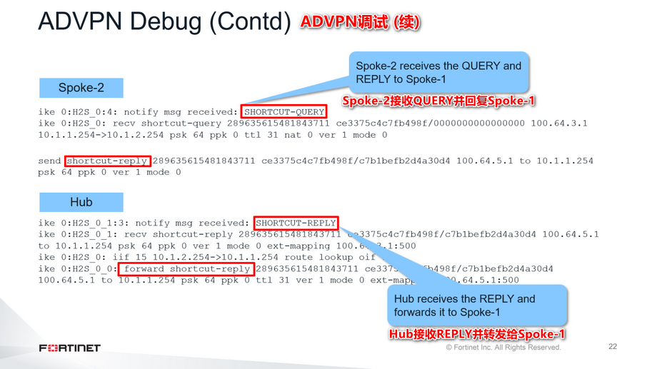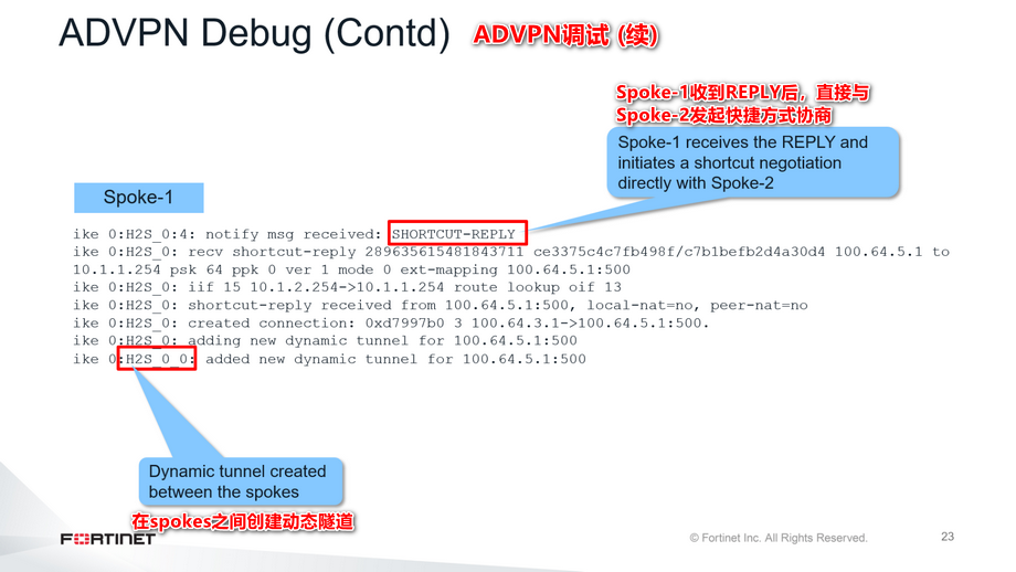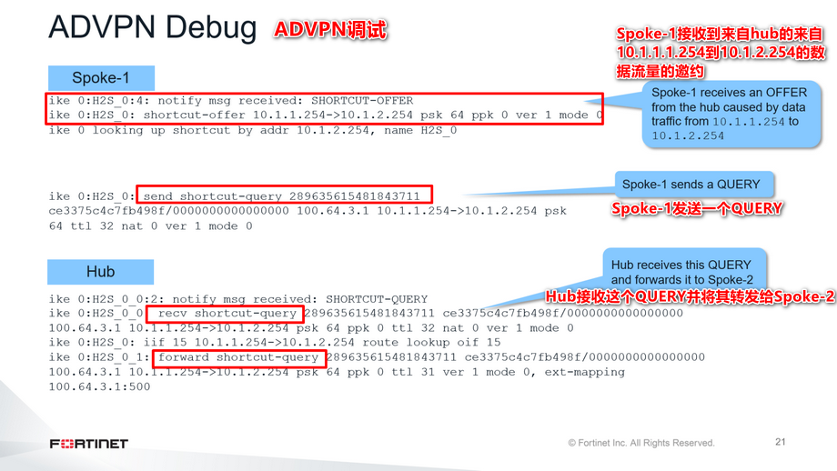 如果在ADVPN隧道的协商过程中执行IKE实时调试命令,可以看到所有快捷方式的交换。这张幻灯片展示了实时调试的输出示例。你可以看到Spoke-1因为从Spoke-1到Spoke-2的数据流量而从集线器收到一个OFFER。