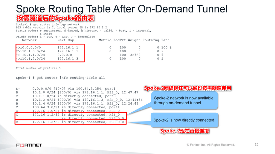 这张幻灯片显示了按需隧道启动后的路由表。