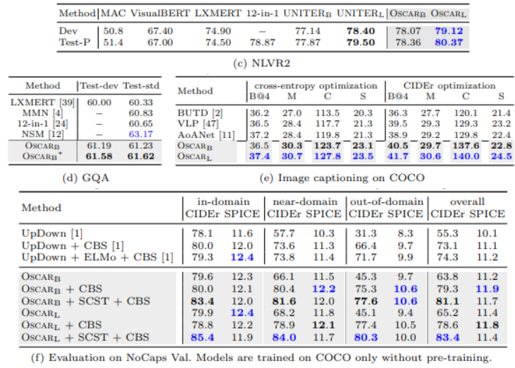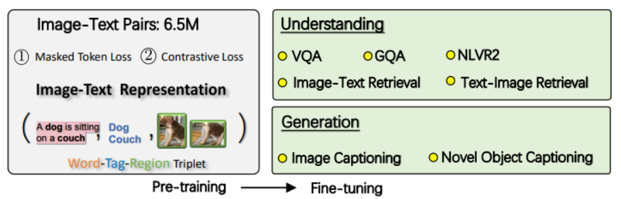 整体预训练+微调的流程: Oscar以三元组作为输入,以两个损失函数为目标进行预训练(在单词和标签上掩盖恢复损失,以及在标签和其他标签之间的对比损失),然后对其进行微调以实现五个理解和两个生成任务。