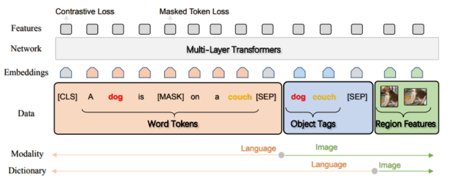 Oscar输入数据:将图文对表示为三元组(橙色单词序列,蓝色物体标签,绿色图片区域特征)。Oscar提出用物体来堆砌跨域语义;删除物体的话,Oscar退化为以前的预训练方法。此三元组可以从两个角度理解:模态视角和字典视角